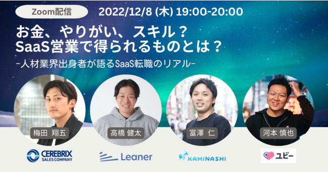 今回は、人材業界からの転職を経験したSaaS企業で活躍している4名を集め、パネルディスカッション形式でお金、やりがい、スキルなど実体験を元にしたリアルな情報をお伝えします。