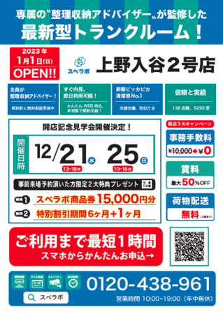 【上野入谷2号店/1月1日(日)オープン】見学から契約、解約まで完全非接触・非対面、お申し込みからご利用まで最短1時間!都内、大阪などにて絶賛運営中のトランクルーム【スペラボ】が入谷駅近くに出店!