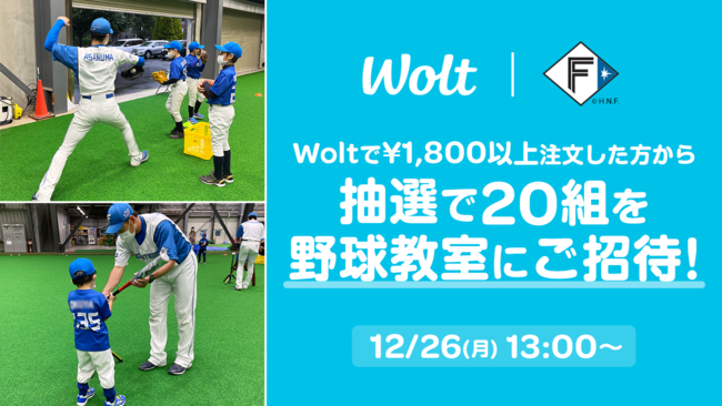デリバリーサービス「Wolt(ウォルト)」を展開するWolt Japan株式会社は、元プロ野球選手で、現在ファイターズ・ベースボールアカデミーでコーチを務める牧谷宇佐美氏の指導による「Wolt xファイターズ こども野球教室」を12月26日(月)に開催、2022年12月8日(木)~12月14日(水)にWoltで1,800円以上ご注文いただいた方の中から抽選で20組をご招待いたします。小学4年生から6年生が参加対象となり、牧谷コーチから楽しく野球指導を受けられるほか、ファイターズの公式マスコット「フレップ」との記念撮影、ファイターズグッズのプレゼントなど豪華特典に加え、ファイターズ選手のサイン入りユニフォームが当たるプレゼント抽選会など内容盛りだくさん!2022年の締めくくりを賑やかに盛り上げます。