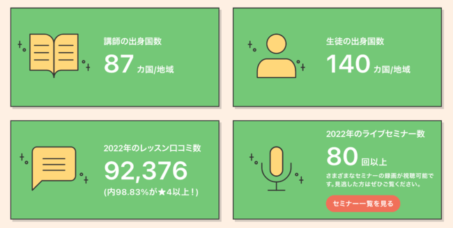 2022年のレッスン口コミ数:92,376件(内98,83%が★4以上)