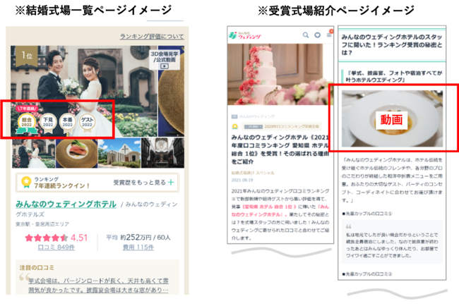 また、受賞式場に関する個別の紹介ページでは、「受賞の決め手」をはじめ、「式場スタッフのおすすめポイント」「未来の花嫁花婿さんへのメッセージ」などを式場スタッフのコメントと『みんなのウェディング』に寄せられた口コミと共に、動画でも紹介します。結婚式場の雰囲気をより具体的にイメージできることで、カップルと結婚式場のマッチ度が高まることが期待されます。
