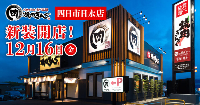 株式会社物語コーポレーション(本社:愛知県豊橋市/代表取締役社長:加藤 央之)は、2022年12月16日(金)に、『焼肉きんぐ 四日市日永店』(三重県四日市市)を新装開店いたします。 [画像1: https://prtimes.jp/i/44964/506/resize/d44964-506-1c1b927d8133423a2255-3.jpg ]