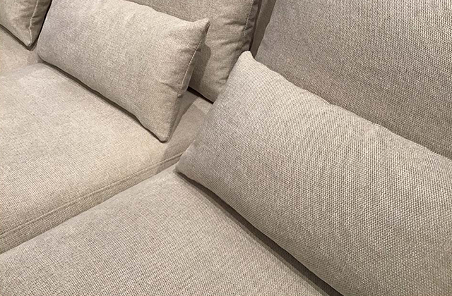 イタリアンモダンの雰囲気を感じさせるポイントは3点です。まず1つ目は、“低さ”。低さを強調させるためにアームも低めに作られています。アームの厚みを薄くするとすっきりはしますが、より上質さを与えるために適度な厚みを確保しています。2つ目は、脚をブラックスチールですっきりと細くデザインし、大きめなサソファーのサイズに対し繊細な印象を与えています。そして3つ目は、背もたれのクッションが独立して見えるように、背もたれのサイズよりやや小さく作っています。