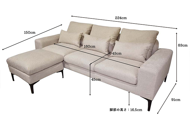 サイズ: 幅224×奥行150(91)×高さ83(45)cm