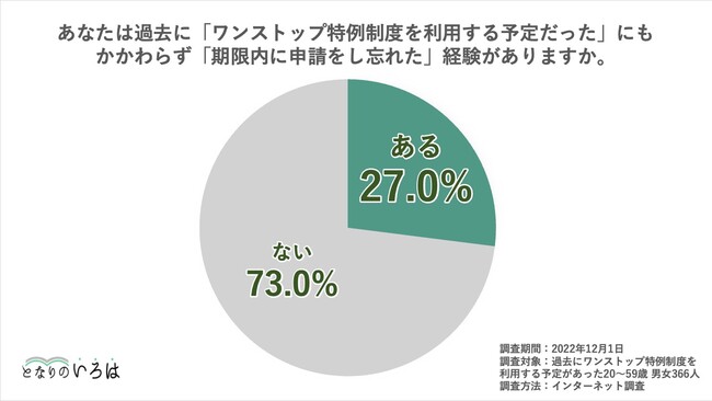 ワンストップ特例制度の申請を後回しにしていると「申請期限を過ぎてしまった」ということも起こってしまうようです。実際に、過去(2021年以前)に「ワンストップ特例制度を利用する予定だった」にもかかわらず「期限内に申請をし忘れた経験がある」と、4人に1人(27.0%)が回答しています。ワンストップ特例制度の申請が間に合わなかった場合、税金控除を受けるためには確定申告をする必要があるため、本来行う予定ではなかった確定申告が必要になってしまった人も一定数いると考えられます。