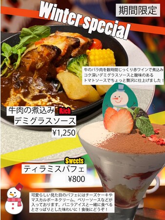 New York Kitchen ARAIリーフウォーク稲沢店(運営:株式会社RAVIPA 本社:東京都豊島区)では、12月限定メニューを12月6日より販売スタート。牛肉煮込みのデミグラスソースと見た目からかわいい冬仕立てのティラミスをご用意!ぜひお楽しみください!