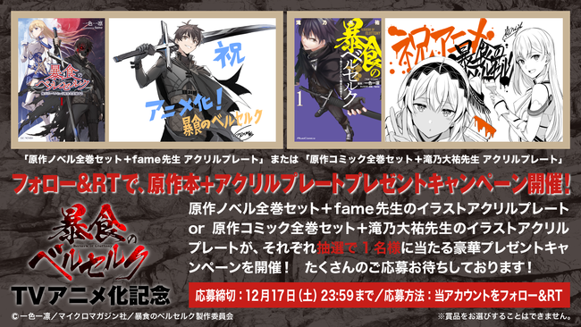 TVアニメ『暴食のベルセルク』(原作:マイクロマガジン社刊)公式Twitterアカウントにて、原作ノベル全巻セット+fame先生のイラストアクリルプレートor原作コミック全巻セット+滝乃大祐先生のイラストアクリルプレートが、それぞれ抽選で1名様に当たる豪華プレゼントキャンペーンを開催しております。