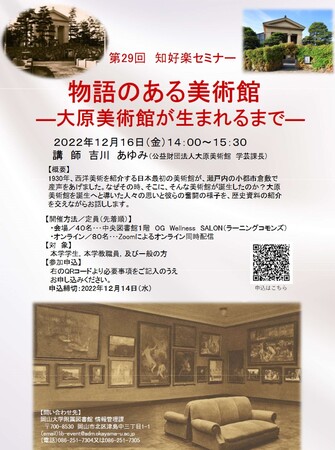◆【岡山大学】岡山大学附属図書館 第29回知好楽セミナー「物語のある美術館-大原美術館が生まれるまで-」〔12/16金, ハイブリッド開催〕