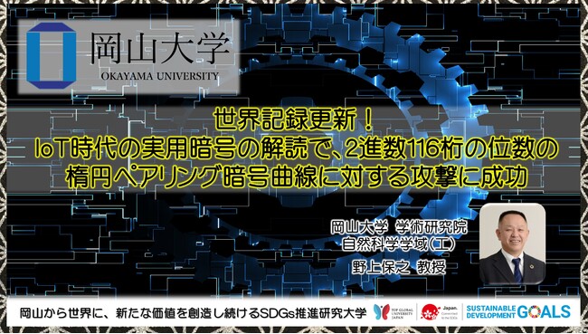 国立大学法人岡山大学(本部:岡山市北区、学長:槇野博史)学術研究院自然科学学域の野上保之教授の研究チームは楕円ペアリング暗号について、約1000CPUコアのPCクラスタを用いた大規模な解読実験を実施し、2進数で116桁、つまり10進数で35桁の大きさを持つペアリング曲線上の楕円離散対数問題の解読に成功しました。