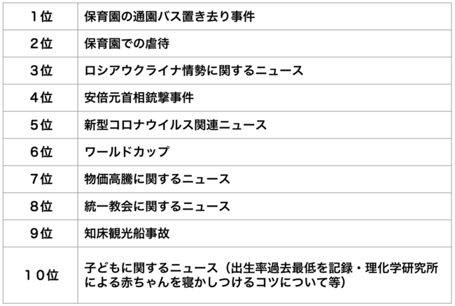 気になるニュースのランキングは、1位2位の保育園で起こった悲しい事件を挙げたママ・パパが全体の約2割を占めました。理由からは、「同じ歳くらいの子どもの親として他人事だと思えない」という声以外に「家の中など危ない箇所の見直しと対策をとりたいと思った」など、身近な危険と安全への備えに意識が高まる傾向にあることがわかりました。
