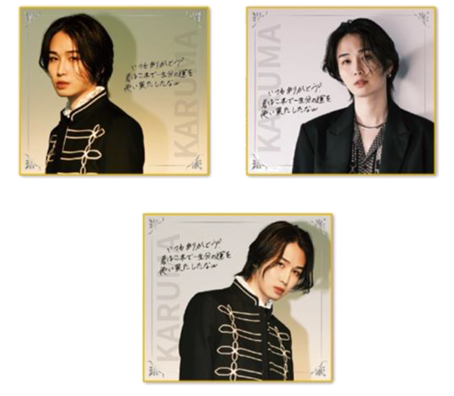 今回の『カルマ』モーリーオンラインスクラッチでは、全6等賞17種類のオリジナルアイテムが当たります。また、スクラッチを10個ご購入につき、通常の賞品にプラスでブロマイド(全3種)からランダムで1枚当たるキャンペーンと、購入した方の中から抽選で3名様に「カルマ 直筆サイン色紙」が当たるWチャンス賞もございます。
