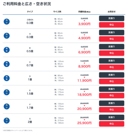 部屋タイプとサイズ、月額料金はこちら