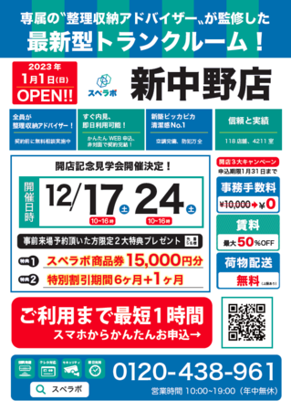 オープンに合わせ12月17日(土)24日(土)に見学会を実施しますので、ぜひ【スペラボ・新中野1号店】にお越しくださいませ。