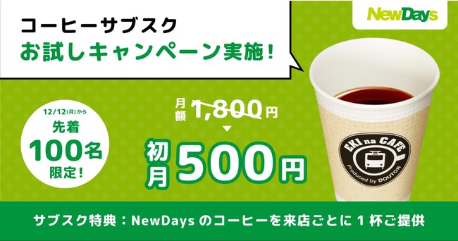「NewDays」では、月額1,800円(税込)でコーヒーを来店ごとに受け取れる『NewDays カウンターコーヒープラン』を提供しています。この度、より多くのお客さまにNewDaysのサブスクサービスを利用していただきたく、12月12日より、通常月額1,800円(税込)の『NewDays カウンターコーヒープラン』が先着100名さま限定で「初月のサブスク利用料が500円(税込)」になるキャンペーンを実施いたします。