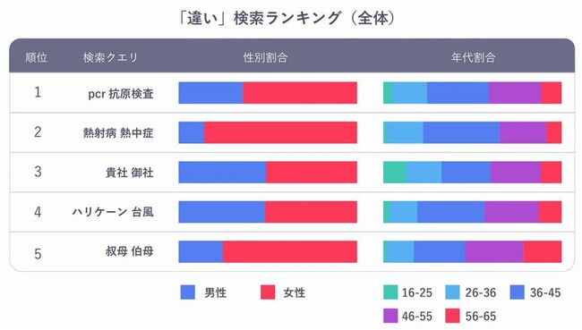 その結果、1位は「PCR(検査)」と「抗原検査」となりました。新型コロナ禍で認知度が高まった二つの検査ですが、違いについて、特によく検索されていました。その他には「伯母」と「叔母」、「貴社」と「御社」などもランクインしました。