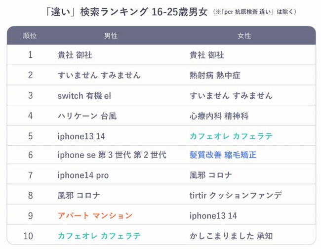 16~25歳の年代に絞ってみると、「カフェオレ」「カフェラテ」の違いが男女ともに調べられているほか、16~25歳男性では初めての一人暮らしを始める際に検索しているのか、「アパート」「マンション」の違いが検索されていました。