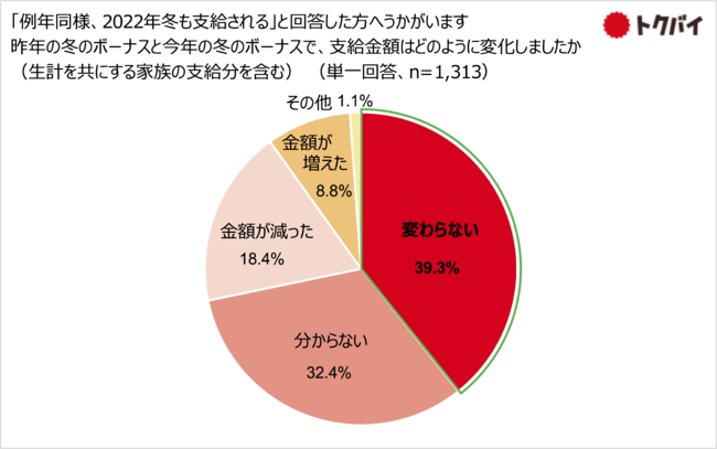 「例年同様、2022年冬も支給される」と回答した方へ、昨年と比べた支給金額の変化についてたずねたところ、「変わらない」との回答が39.3%で最多となり、次いで「分からない」が32.4%となりました。さらに、「金額が減った」が18.4%で約2割にのぼりました。