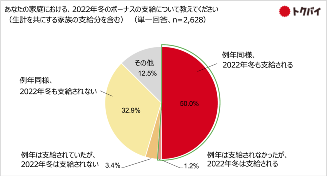 2022年冬のボーナスの支給(生計を共にする家族の支給分を含む)についてたずねたところ、「例年同様、2022年冬も支給される」との回答は50.0%、「例年は支給されなかったが、2022年冬は支給される」との回答が1.2%で、合わせて約5割にとどまりました。