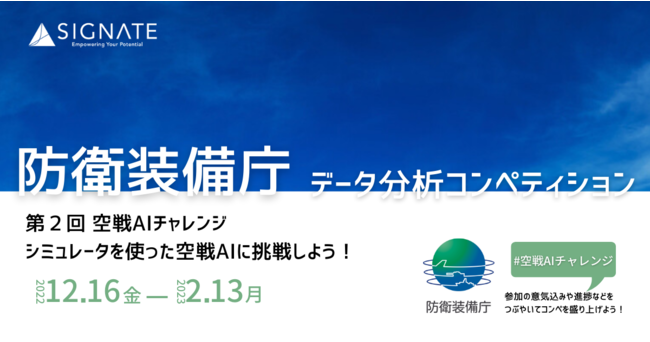 AI開発・運用、DX人材育成サービスを提供する株式会社SIGNATE(本社:東京都千代田区、代表取締役社長:齊藤 秀、以下 SIGNATE)は、データサイエンスプラットフォーム「SIGNATE(R)」にて、防衛装備庁主催のデータ分析コンペティション「第2回 空戦AIチャレンジ~シミュレータを使った空戦AIに挑戦しよう!~」を、本年12月16日(金)より開始いたします。