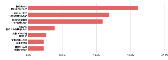 さらに、どんなシーンで上記のものづくりを体験したいかという問いには、「旅行先での思い出作りとして」が最も多く32.1%、続いて「お出かけ先で一緒に作業をしたい」が23.8%となりました。ものづくりをする体験時間そのものを、思い出に残る大切な時間と捉えていることが伺えます。続いて、3番目に多かった回答は「なにかの記念にモノを残したい」という結果になりました。体験後もモノが残るものづくりだからこそ、なにかの記念に体験したいという人が多くなっています。