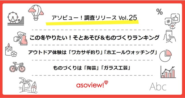 休日の便利でお得な遊び予約サイト「アソビュー!」(URL:https://www.asoview.com/、以下:アソビュー!)を運営するアソビュー株式会社(所在地:東京都品川区、代表執行役員CEO:山野智久、以下、当社)は、冬休みに向けて、アソビュー!会員5,807名にアンケート調査を行いました。その結果を、「この冬やりたい!そとあそびランキング」と「この冬やりたい!ものづくりランキング」としてランキング形式で発表します。