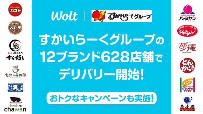 デリバリーサービス「 Wolt(ウォルト) 」を展開するWolt Japan株式会社は、このたび株式会社 すかいらーくホールディングスと提携し、「ガスト」「バーミヤン」「ジョナサン」など、すかいらーくグループ傘下の12ブランド628店舗でのデリバリーサービスを開始しました。