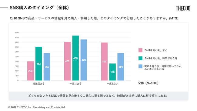 購入のタイミングは「SNSを見た後、時間がある時」の割合が最多