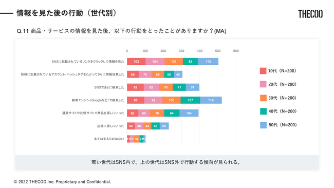 世代別では、10~20代の若い世代はSNS内で行動する傾向が多く、世代が上がるにつれてSNS外で行動する傾向がみられました。