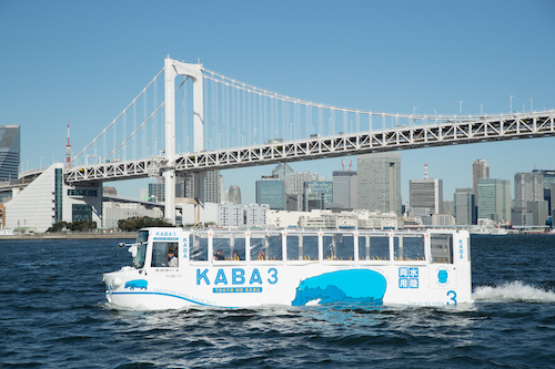 2017年11月に開業した水陸両用バス「TOKYO NO KABA」は、古代エジプトの守り神であるカバをイメージしています。都心からレインボーブリッジを通り、お台場エリアのビル群を走り抜けながら陸上走行したあと、お台場海浜公園から大きな水しぶきをあげて東京湾へダイブ!澤内氏のガイドとともに自然と都会の調和の美しさを満喫!水陸両用バスとしては世界初である「高品質3Dサウンド演出」による臨場感あふれる体験を、バスガイドの観光案内とともにお楽しみください。