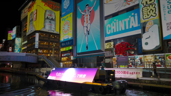 LEDアドクルーズは、人気観光地としても名高い道頓堀川をはじめ、水都大阪を走る日本初のLEDビジョン搭載広告船です。船には約2m×8mの大型LEDビジョン2枚とアンプスピーカーを搭載し、鮮明な映像とパワフルな高音質サウンドにより、圧倒的なインパクトを残す広告を届けることができます。
