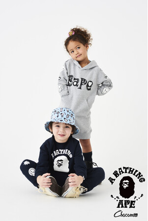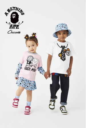 今回のコレクションでは、Tシャツやスウェットから、スカートやロンパースまで豊富なラインナップで展開し、ベビーからキッズまで幅広い年齢の子どもに楽しんでもらえるのも魅力のひとつ。また、デザインには「A BATHING APE(R)︎」定番の「APE HEAD」や人気キャラクター「BABY MILO(R)︎(ベイビーマイロ)」、さらには「Chocomoo」の代名詞的存在であるハートのキャラクターを採用するなど、どちらのファンにとってもたまらないスペシャルなコラボレーションに仕上がっています。