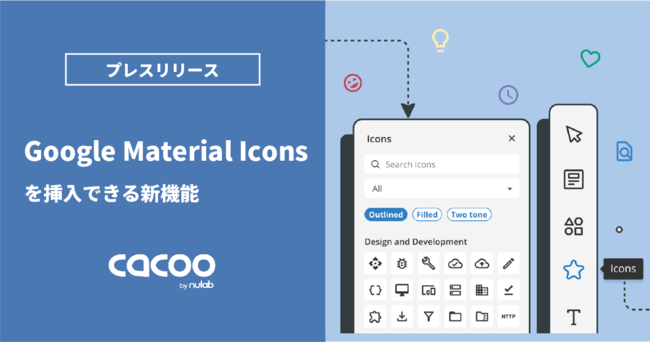 株式会社ヌーラボ(本社:福岡県福岡市、代表取締役:橋本正徳、以下 ヌーラボ)は、提供するオンライン作図ツール「Cacoo(カクー)」に、Google社が提供するオープンソースのアイコンフォントである「Google Material Icons」から200種類以上を図形として挿入できる新機能を追加しました。
