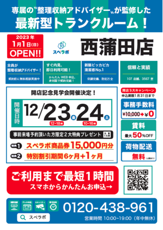【西蒲田店/1月1日(日)オープン】見学から契約、解約まで完全非接触・非対面、お申し込みからご利用まで最短1時間!都内、大阪などにて絶賛運営中のトランクルーム【スペラボ】が西蒲田に出店!