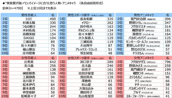 “家族愛が強い”というイメージに合う【スポーツ選手(引退した人含む)】についてみると、男性スポーツ選手では1位「長友佑都さん」(320名)、2位「イチローさん」(262名)、3位「田中将大さん」(163名)、女性スポーツ選手では1位「浜口京子さん」(289名)、2位「北斗晶さん」(246名)、3位「谷亮子さん」(161名)となりました。