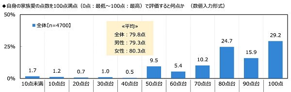 自身の家族愛を100点満点で評価 全体平均は79.8点、男性平均は79.3点、女性平均は80.3点
