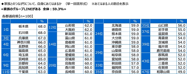 「家族のグループLINEがある」全体の59%、都道府県別の1位は栃木県と石川県