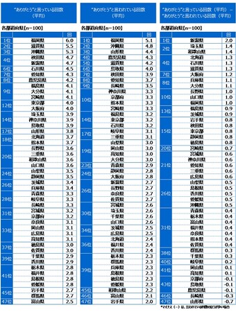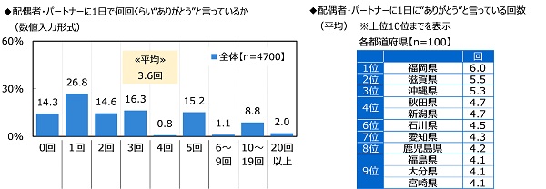 都道府県別にみると、配偶者・パートナーから1日に“ありがとう”と言われている回数の平均は、福岡県(5.1回)が最も多くなり、沖縄県(4.8回)、山形県(4.4回)が続きました。