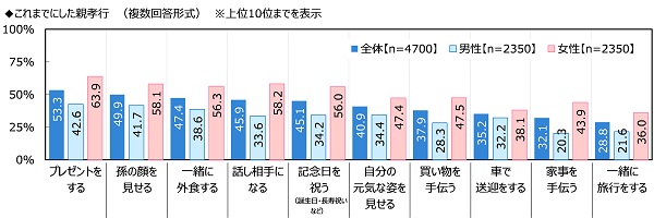 男女別にみると、女性では「プレゼントをする」が63.9%、「話し相手になる」が58.2%、「記念日を祝う(誕生日・長寿祝いなど)」が56.0%、「家事を手伝う」が43.9%と、男性(順に42.6%、33.6%、34.2%、20.3%)と比べて20ポイント以上高くなりました。