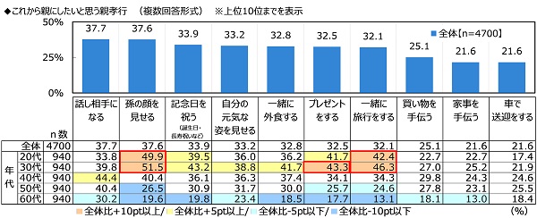 年代別にみると、20代と30代では「孫の顔を見せる」(順に49.9%、51.5%)と「一緒に旅行をする」(42.4%、46.3%)、30代では「プレゼントをする」(43.3%)が全体と比べて10ポイント以上高くなりました。