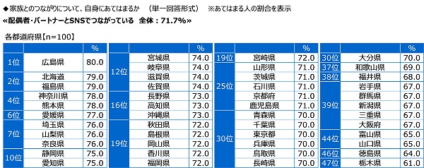 「配偶者・パートナーとSNSでつながっている」全体の72%、都道府県別の1位は広島県
