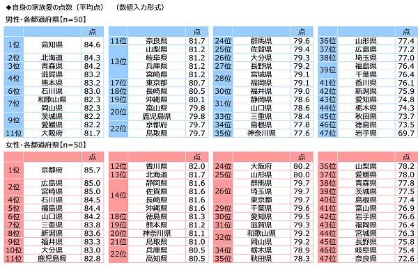 ジブラルタ生命調べ 自身の家族愛を100点満点で評価 全体平均は79.8点、自己評価が高い都道府県 男性1位「高知県」、女性1位「京都府」