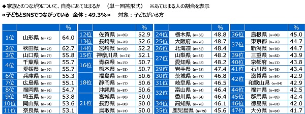 「子どもとSNSでつながっている」子どもがいる人の49%、都道府県別の1位は山形県