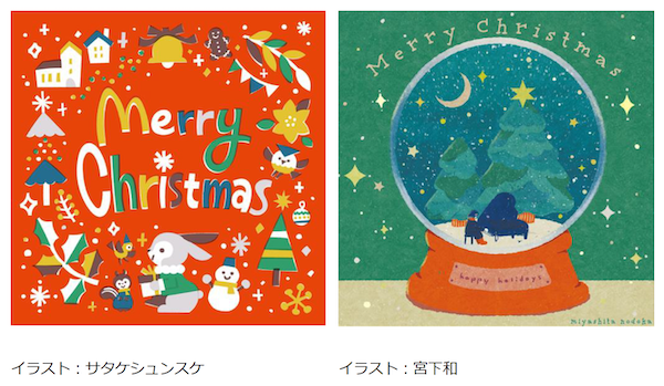 「giftee(R)」のギフトにはオシャレなギフトカードを添えることができます。今年はイラストレーターのサタケシュンスケさん、宮下和さんによるクリスマス限定デザインを提供しています。