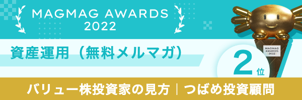 つばめ投資顧問が発行するメールマガジン「バリュー株投資家の見方」が「まぐまぐ大賞2022・資産運用(無料メルマガ)」の部門で第2位を獲得しました。