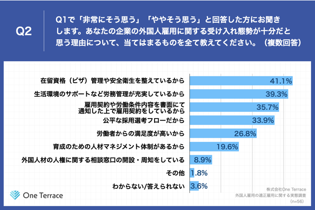 Q1で「非常にそう思う」「ややそう思う」と回答した方に、「Q2.あなたの企業の外国人雇用に関する受け入れ態勢が十分だと思う理由について、当てはまるものを全て教えてください。(複数回答)」(n=56)と質問したところ、「在留資格(ビザ)管理や安全衛生を整えているから」が41.1%、「生活環境のサポートなど労務管理が充実しているから」が39.3%、「雇用契約や労働条件内容を書面にて通知した上で雇用契約をしているから」が35.7%という回答となりました。