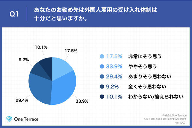「Q1.あなたのお勤め先は外国人雇用の受け入れ体制は十分だと思いますか。」(n=109)と質問したところ、「非常にそう思う」が17.5%、「ややそう思う」が33.9%という回答となりました。