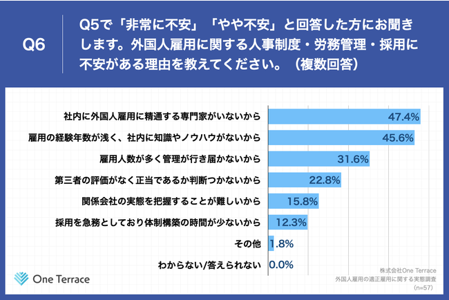 Q5で「非常に不安」「やや不安」と回答した方に、「Q6.外国人雇用に関する人事制度・労務管理・採用に不安がある理由を教えてください。(複数回答)」(n=57)と質問したところ、「社内に外国人雇用に精通する専門家がいないから」が47.4%、「雇用の経験年数が浅く、社内に知識やノウハウがないから」が45.6%、「雇用人数が多く管理が行き届かないから」が31.6%という回答となりました。