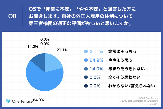 Q5で「非常に不安」「やや不安」と回答した方に、「Q8.自社の外国人雇用の体制について第三者機関の適正な評価が欲しいと思いますか。」(n=57)と質問したところ、「非常にそう思う」が21.1%、「ややそう思う」が64.9%という回答となりました。