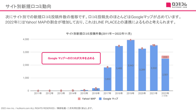 次にサイト別での新規口コミ投稿件数の推移です。口コミ投稿先のほとんどはGoogleマップが占めています。2022年にはYahoo! MAPの割合が増加しており、これはLINE PLACEとの連携によるものと考えられます。