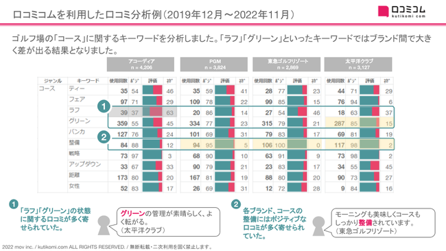 ・「ラフ」「グリーン」といったコース整備に関するキーワードではブランド間で大きく差が出る結果となったこと